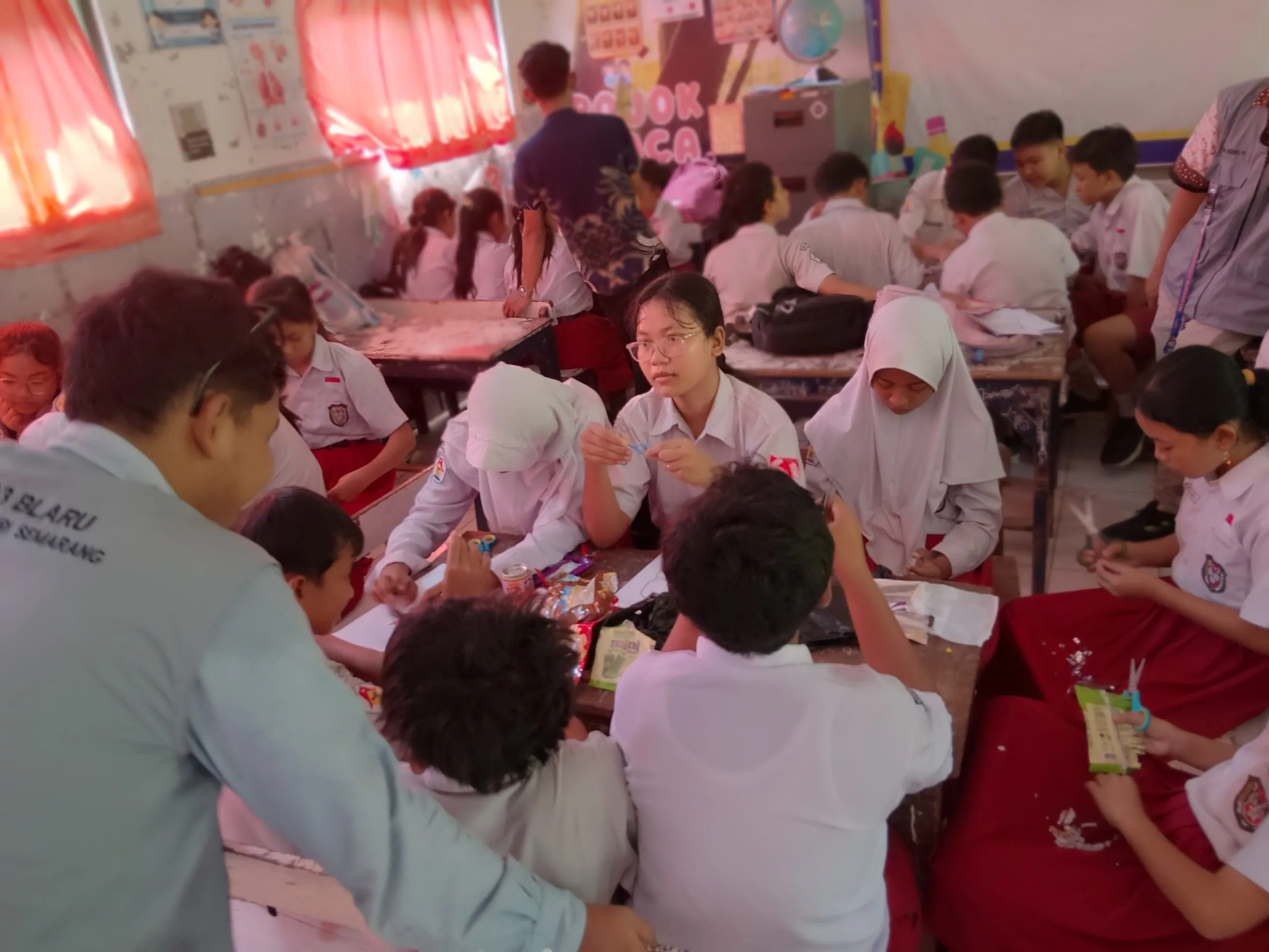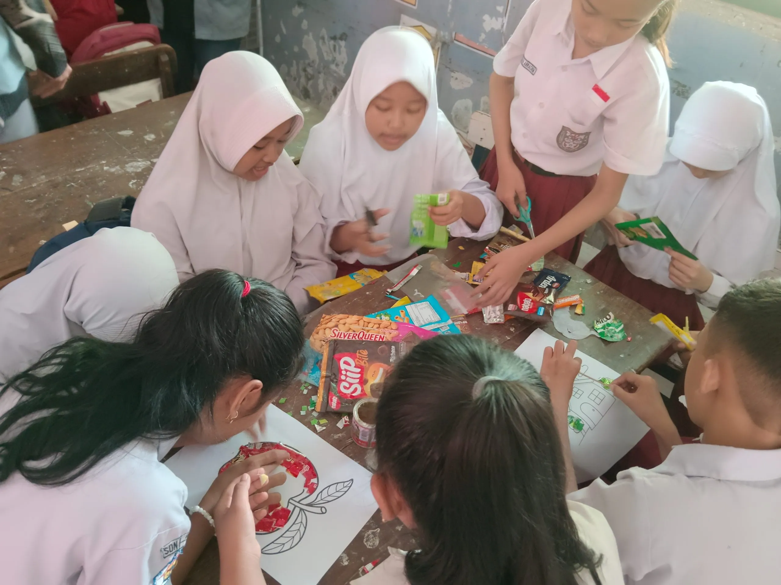 Kegiatan dimulai dengan sesi pembagian kelompok. Siswa dibagi dalam beberapa kelompok kecil dan mulai melakukan praktik langsung pembuatan karya kolase dari bahan daur ulang.